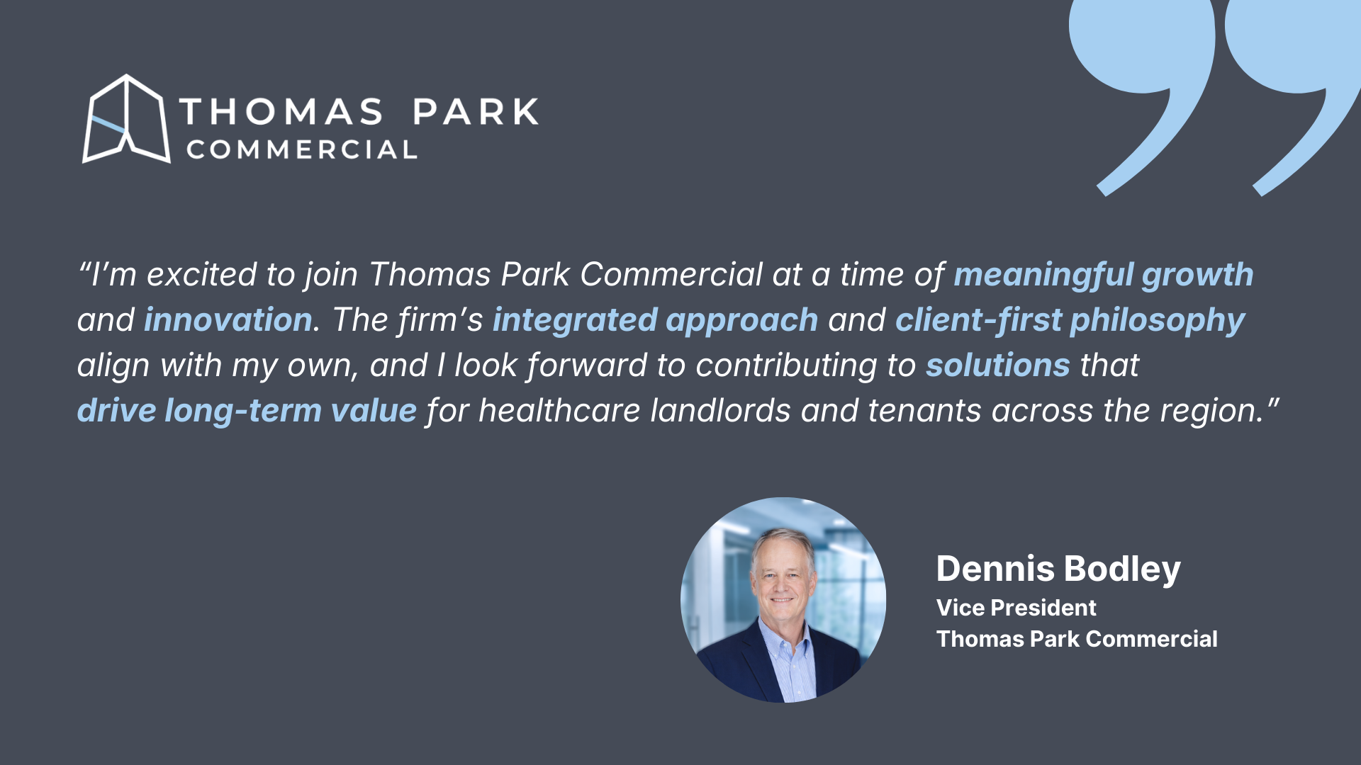 Thomas Park Commercial is pleased to announce the appointment of Dennis Bodley as Vice President within its brokerage division. With more than 25 years of commercial real estate experience, Dennis’s addition strengthens the firm’s capabilities in healthcare real estate and reinforces its commitment to serving medical landlords, tenants, and investors throughout the Mid-Atlantic.